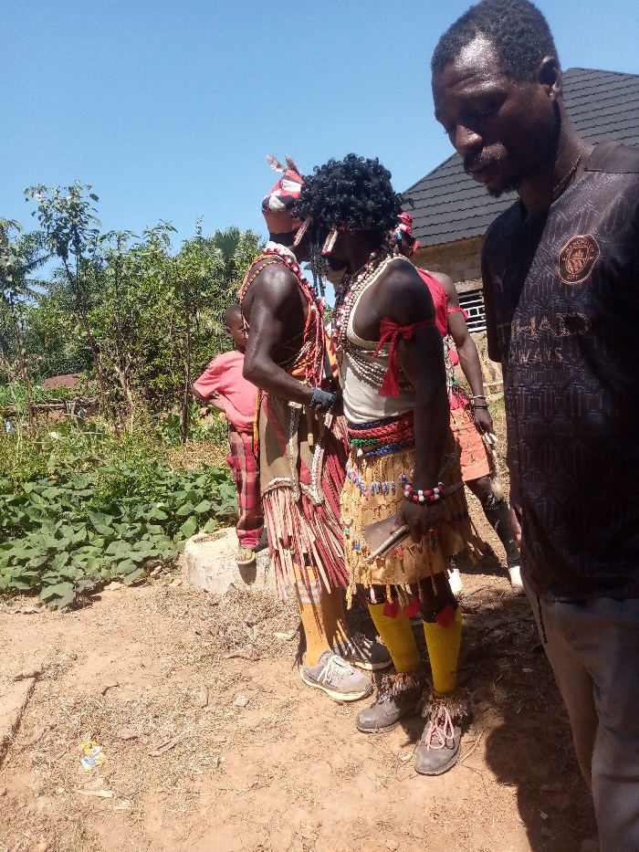 An outdoor scene in Kaninkon, Nigeria, features multiple individuals under a clear blue sky. In the immediate foreground, to the right, a dark-skinned male with short hair wears a dark short-sleeved t-shirt with a light-colored emblem and light-colored pants, looking downward and to the left. To his left, slightly behind, stands a dark-skinned male in elaborate traditional attire, facing left. He wears a white sleeveless top, a skirt-like garment adorned with tassels and beads, yellow knee-high socks, and dark boots. He has a dark, curly wig, multiple beaded necklaces, red arm ties, and a white, red, and black beaded bracelet on his right wrist, holding a dark rectangular object. Adjacent to him on the left, another dark-skinned male in traditional attire stands facing left, with a muscular bare torso. He wears a red and white patterned headdress, multiple beaded necklaces, a brown and red striped fringed loincloth, and light-colored sneakers. Dark gloves are visible on his hands. In the left background, a person in a red shirt is partially visible, standing on a concrete block. Further to the right in the background, another partially visible person wears a red top and patterned lower garment. The ground is dirt with scattered dry vegetation, and green foliage and bushes are prominent on the left side of the frame. A building with a dark tiled roof is visible in the right background.