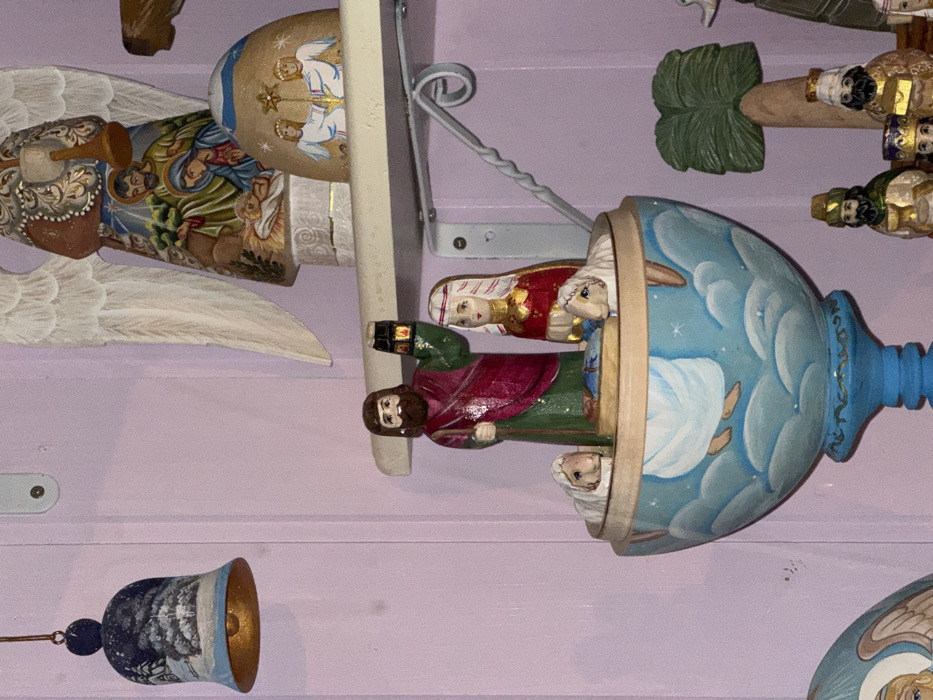 variety of hand-painted, wooden Christmas decorations arranged on a light purple surface. To the left, an angel with white wings and a horn is depicted. Adjacent is a nativity scene within a blue egg-shaped ornament, featuring Joseph, Mary, and a sheep. Another partially visible ornament depicts angels. A blue bell with a winter scene hangs at the bottom left. The decorations are placed near a white shelf support.