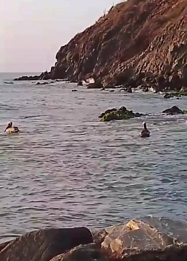 two pelicans swimming in the ocean. They are in the water near a rocky shore. A large, brown, rocky hill is in the background. The sky is overcast.