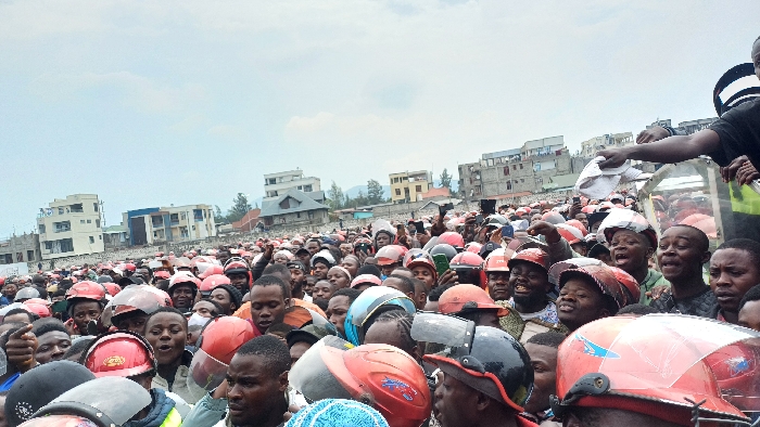 A dense crowd of hundreds of individuals, predominantly adult males, is captured outdoors in Goma, Democratic Republic of the Congo, under an overcast sky