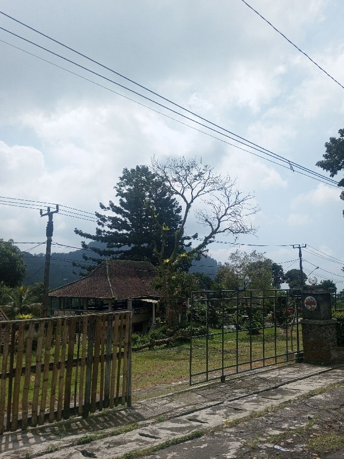 This image depicts an outdoor scene in the city of Niz Lakuk, India, under a partly cloudy daytime sky. In the foreground, a concrete or paved ground surface, likely a driveway, is visible with a bamboo slat gate on the left and a dark-colored metal grid gate on the right, both appearing partially open. The gates open onto a grassy area. In the midground, a traditional-style building with a multi-tiered, reddish-brown tiled roof and an open-air lower level with wooden railings is situated. A tall, dense conifer tree stands behind and to the left of the building. To the right of the conifer, a large, mostly bare deciduous tree with some sparse green foliage is present. Further to the right, a stone pillar with a circular emblem or light fixture on its top marks the gate opening. The background features rolling green hills or mountains beneath the cloudy horizon. Multiple utility poles with overhead power lines are visible crossing the upper portion of the frame. No individuals are present.