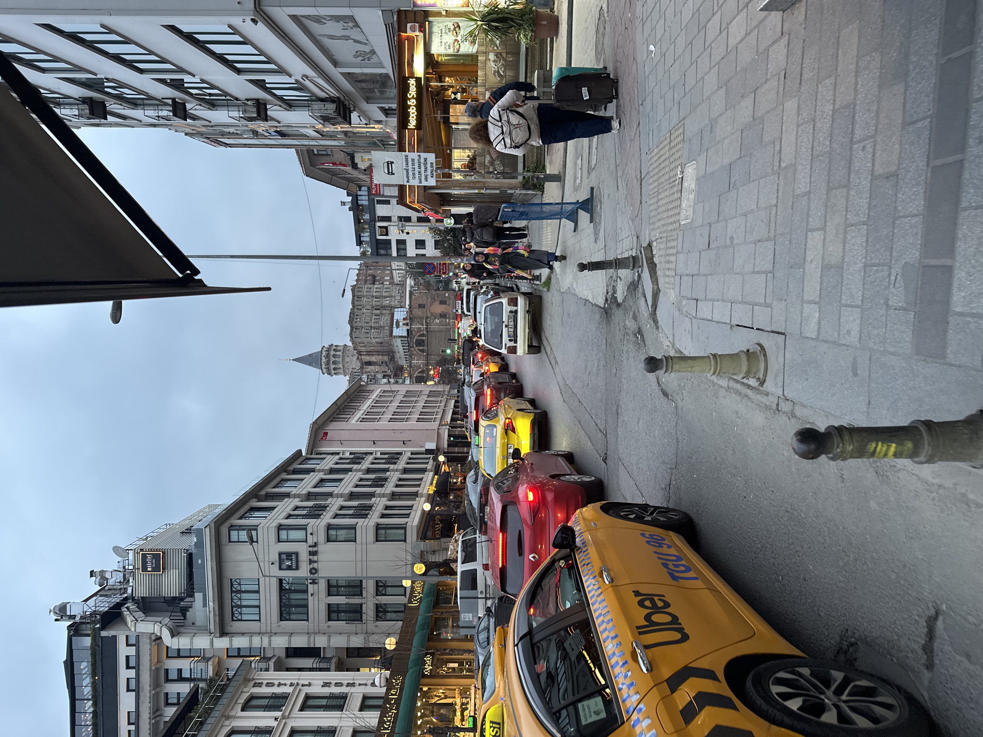 The image depicts an urban street scene in Beyoğlu, Turkey, specifically on or near Mumhane Caddesi, with the Galata Tower prominently visible in the distant background under an overcast sky. In the foreground, a grey, rectangular-paver sidewalk is visible on the right, bordered by two dark metal bollards. A yellow Uber-branded taxi, license plate TGU 96, occupies the left side of the frame, positioned on the street. The street itself is characterized by heavy, stationary traffic, consisting of a dense line of vehicles including multiple yellow taxis, a red hatchback, a white sedan (a Fiat Uno type, license plate 53 AJ 430), and other cars. Many vehicles display illuminated red brake lights. On the right-hand sidewalk, several pedestrians are observed. A woman in a light-colored jacket, dark pants, and a white backpack is pulling a dark green rolling suitcase with her right hand, walking forward. A man in a dark jacket walks immediately to her left. Further ahead on the sidewalk, another woman in a striped scarf and dark coat walks. Blue temporary pedestrian barriers are positioned on this sidewalk. Buildings line both sides of the street. On the right, multi-story structures house commercial establishments, including a visible "Kebab & Steak" restaurant with an outdoor seating area and a brown awning extending over the sidewalk. A partial white sign in Turkish is visible, stating "MUHHANE CADDESİ 12:00 İLE 19:00 SAATLERİ ARASINDA ARAÇ TRAFİĞE KAPALIDIR" (Mumhane Street closed to vehicle traffic between 12:00 and 19:00). The left side features multi-story hotel buildings, including "HOTEL MORI" and another building marked "HOTEL," with a "Mükellef" sign visible on a rooftop structure. The architecture consists of both modern and neoclassical styles, featuring numerous windows and some balconies. Streetlights and utility wires are visible throughout the midground. The overall lighting is flat, consistent with an overcast sky or late afternoon.