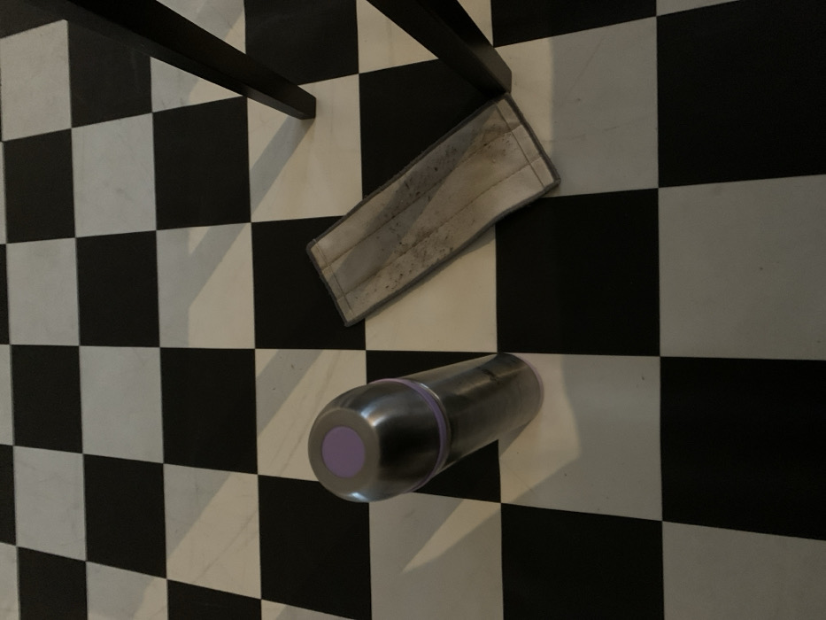 A checkerboard floor tile pattern is the backdrop for an arrangement of objects. A dark metal cylinder with a purple end cap sits on the white square. Next to it is a grey, rectangular mop head with visible dirt. Above the mop head, part of a black chair leg is visible in the upper left corner.