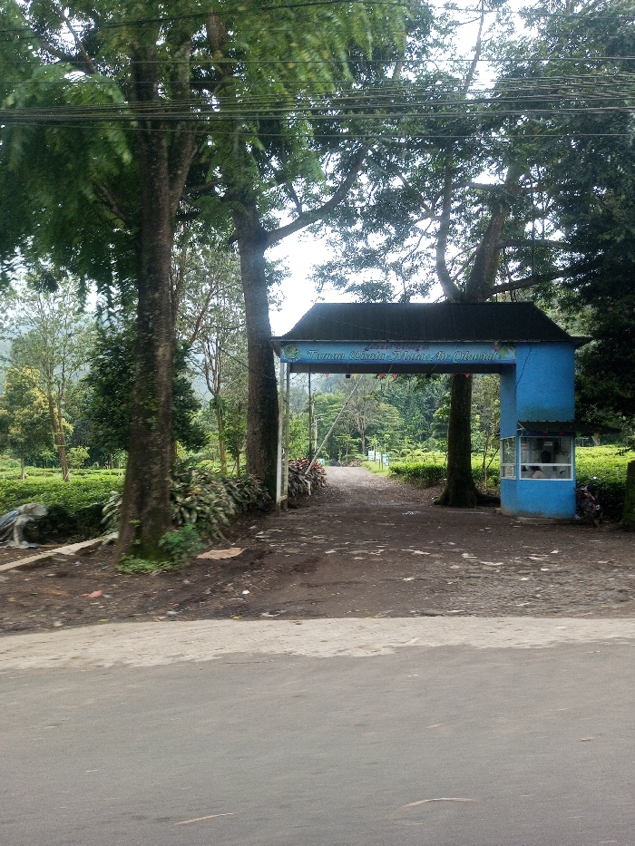 This image depicts the entrance to a natural or recreational area in Jabalpur, India. The foreground shows a paved road, dark grey with minor discoloration and scattered debris. Beyond the road, a dirt path leads into the area. The entrance is marked by a prominent light blue archway structure with a dark, sloped roof. A horizontal sign on the archway displays blue text, identifying the location as "Taman Wisata Mata Air Cibolang". Two large trees with dark, textured trunks and dense green foliage flank the archway. To the right of the archway stands a small, light blue building, consistent with a guard or ticket booth, featuring multiple glass windows. One individual is partially visible inside this booth, appearing to be seated. A dark-colored scooter is parked to the right of the booth. To the left of the archway, a white barrier is partially visible, adjacent to a grey concrete statue resembling a large bird, possibly a heron, positioned near a small water channel. The area beyond the entrance archway is characterized by dense, cultivated green vegetation, including rows of low-lying plants suggesting a plantation, and various taller trees. Distant green hills are visible in the background under an overcast sky. Multiple dark power lines traverse the upper portion of the image, running horizontally through the tree canopies.