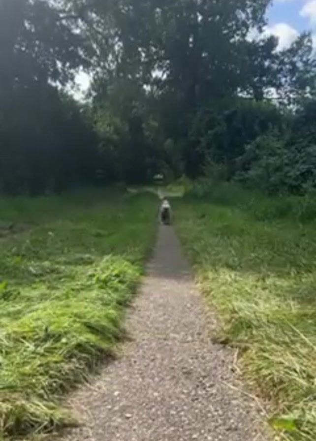 dog on a leash being called back by a person on a gravel path in a grassy field. The dog is small and fluffy, and the path leads into a wooded area. The trees are dense and provide shade. The dog trots toward the camera, which is held low to the ground. The sky is partly cloudy.