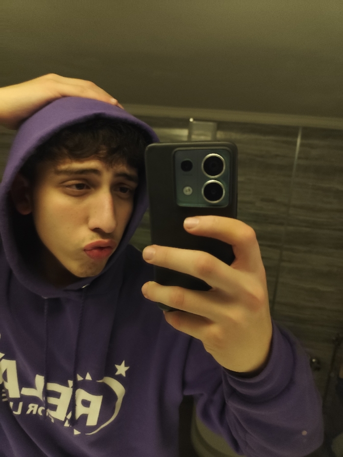 A young man with curly brown hair wears a purple hoodie with white lettering. He holds his phone up in a bathroom selfie. The phone has a black case and dual cameras. The man has one hand on the hood of his hoodie. His lips are pursed slightly. A gray wall is behind him.