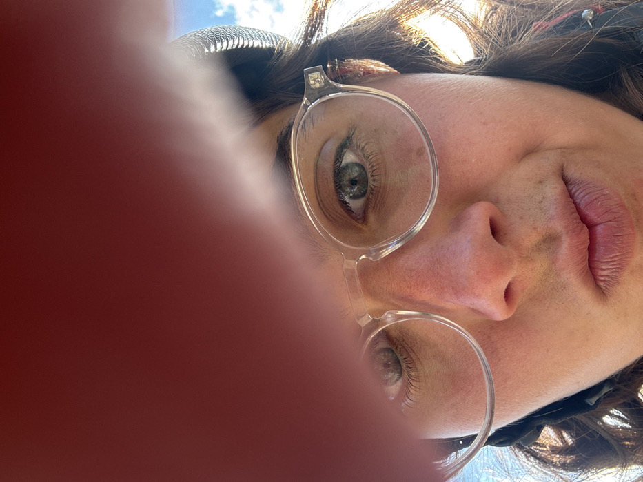 The image displays a close-up, upward-angled selfie of an individual's face, predominantly a female, partially obscured by a reddish-brown object, likely a finger, in the upper left quadrant. The individual has fair skin, green eyes visible through clear, round-framed spectacles, and dark hair, part of which is visible on the right side. A dark, possibly ribbed object resembling a helmet is partially visible on the right side of the head. The individual's lips are slightly pursed, forming a pout. Strong sunlight illuminates the right side of the face and hair, indicating an outdoor setting. A patch of blue sky with white clouds is visible in the upper right corner. No discernible features or landmarks within the image identify the location as the city of Nadao, Laos.