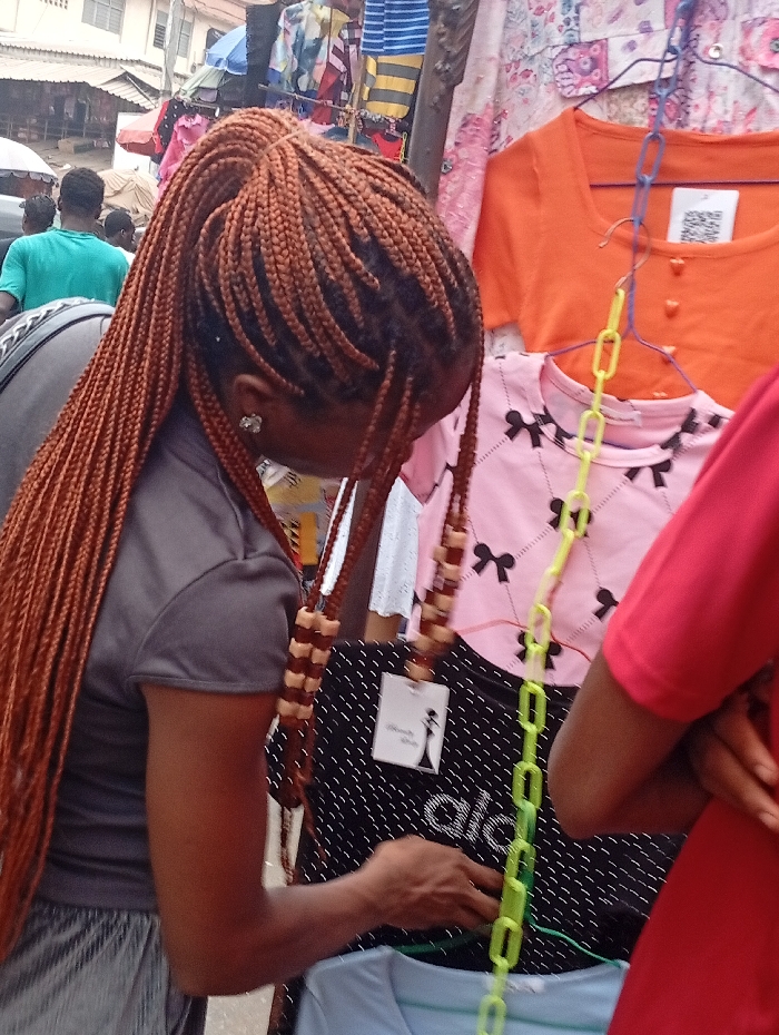 A woman with long, copper-toned braids, some adorned with wooden beads, browses clothing at an outdoor market. She wears a gray top and printed skirt. A variety of garments hang on racks, including an orange top with a QR code tag, a pink shirt with black bows, and a black and white patterned top with "Alo" printed on it. Other people are visible in the background.