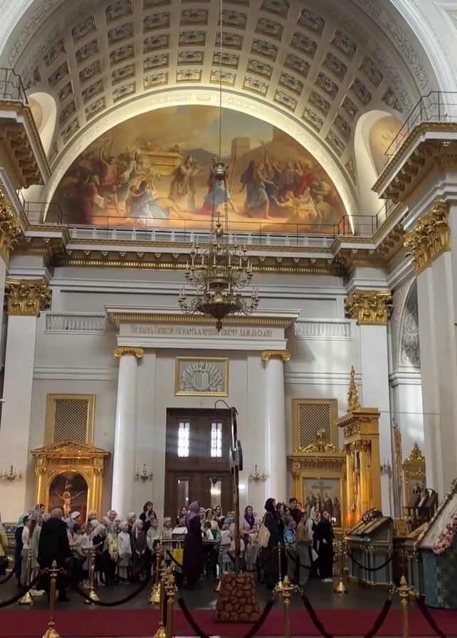 The camera pans upward in a large interior space, likely a cathedral, featuring high vaulted ceilings and white walls adorned with gold accents. A large mural is above a central doorway, below which a group of people, many of whom are children wearing headscarves, are gathered behind a velvet rope barrier. A chandelier hangs from the ceiling. The overall atmosphere appears to be religious or cultural in nature.