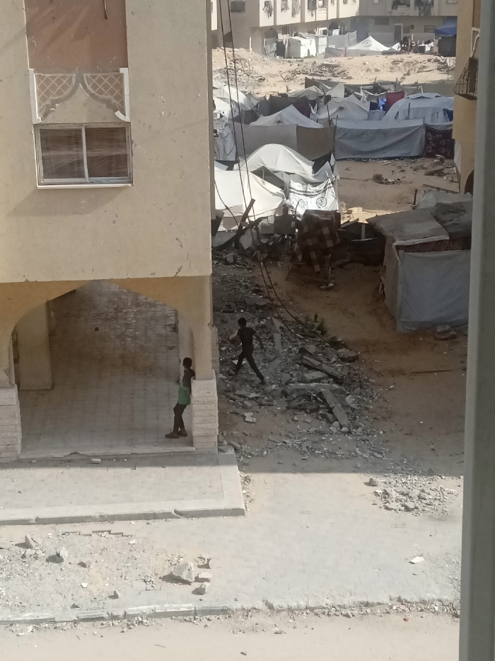The image depicts a scene in Khan Yunis, Palestinian Territory, viewed from an elevated position. In the foreground, the beige facade of a multi-story building is visible, featuring an arched ground-level passage and a window with a decorative grate on an upper floor. A young individual in a green shirt is leaning against a pillar within the arched passage. Adjacent to the building, a paved area transitions into a debris-strewn, unpaved terrain. Another young individual, dressed in dark clothing, is captured mid-stride traversing this rubble-filled ground. The midground and background reveal a sprawling encampment of numerous makeshift tents and shelters, constructed from various fabrics and tarpaulins, some appearing damaged or incomplete. Beyond this tent settlement, several multi-story residential buildings are visible against a hazy horizon. The overall environment is characterized by sandy, unpaved ground, significant debris, and a lack of substantial vegetation, under bright daylight conditions.