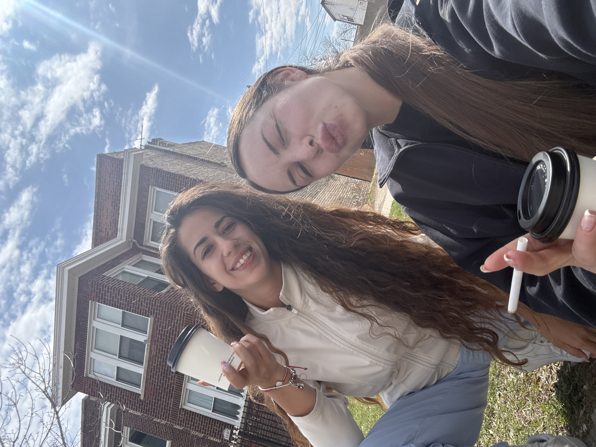 Two young women are outdoors on a sunny day. The woman in the foreground is smiling and holding a white cup with a black lid. She is wearing a light-colored jacket and blue pants. Her long, brown hair is flowing. The other woman is making a kissing face. She is wearing a dark jacket and has long, brown hair. She is holding a white cigarette in her hand and a black cup with a white lid. They appear to be sitting on the ground in front of a red brick building with white-framed windows. The sky is blue with scattered clouds. The building has the street address "3347" on it, which is consistent with the street addresses found on the 3300 block of North Clark Street, in the Lakeview neighborhood of Chicago, Illinois.