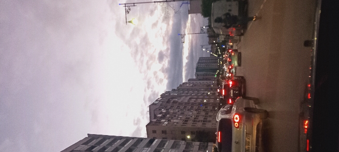 A street scene shows a line of cars with illuminated taillights, facing forward. Buildings line the left side of the street. Streetlights and overhead wires are visible against a cloudy sky. The photo is taken at dusk or dawn, casting a dim light over the urban landscape. The perspective suggests the photo was taken from inside a vehicle.