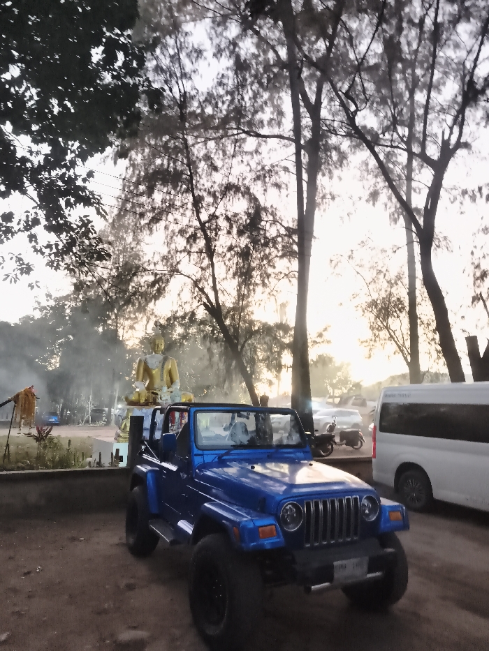 The image depicts an outdoor area in Baan Mae Nam, Thailand, during low light conditions, indicative of either sunrise or sunset. A blue Jeep Wrangler, convertible, is parked in the foreground on an unpaved surface, oriented towards the right. It features black wheels. Behind the vehicle and to its left stands a prominent golden Buddha statue, depicted in a meditative posture, seated on a multi-tiered white pedestal. Adjacent to the Buddha statue on the left, an area emits smoke or haze, with orange fabric draped over a pole structure. A low concrete barrier runs across the scene. Numerous trees with slender trunks and sparse foliage are present throughout, particularly silhouetted against the bright sky. In the background, a white passenger van is parked on the right, accompanied by other indistinct vehicles and motorcycles. The atmosphere is hazy.