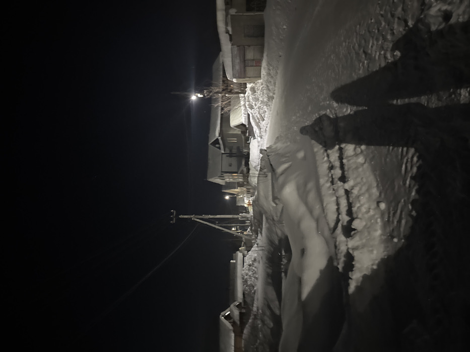 A nighttime scene depicts a snow-covered street lined with houses. The snow is piled high on the sides of the road. Streetlights illuminate the scene, casting long shadows. A power line runs along the street. The sky is dark, with no visible stars or moon. The houses are simple in design, with gabled roofs and small windows. The overall impression is one of stillness and quiet.