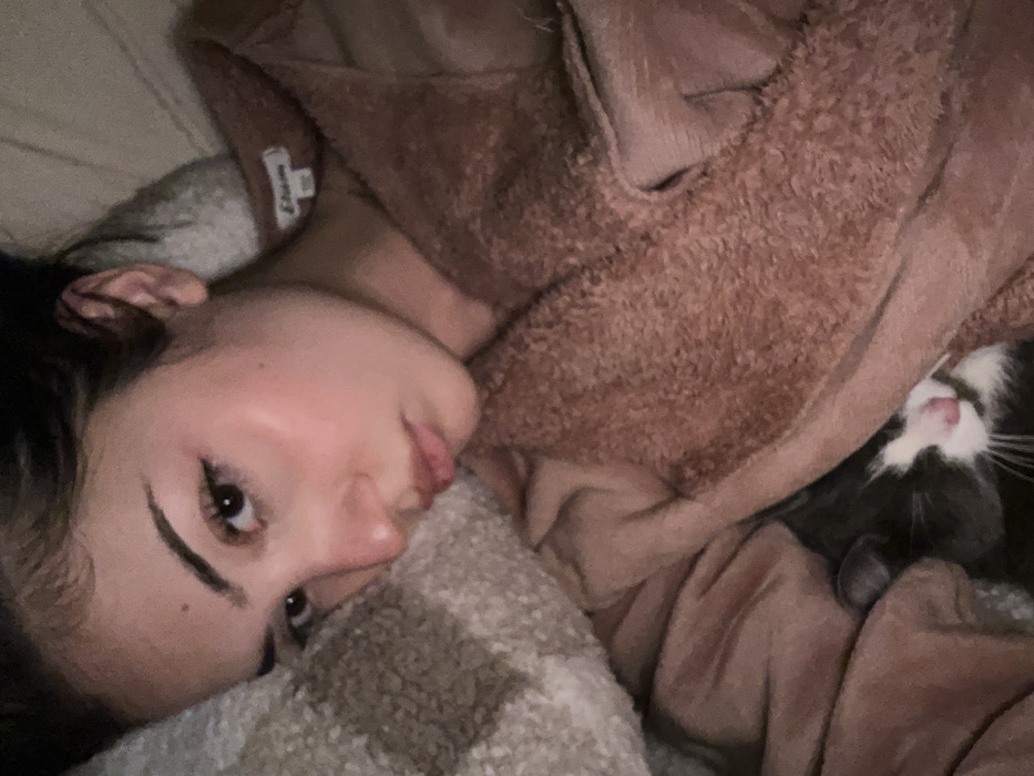 A young woman with dark hair, lying on her side, is depicted indoors in Schiltigheim, France. Her head rests on a light-colored, textured blanket or pillow. She is wearing a reddish-brown, fuzzy garment, possibly a robe, with a partially visible "Etam" label near her right shoulder. Her left eye is open, and she looks directly towards the viewer with a neutral expression. Partially concealed beneath her arm and the reddish-brown fabric is a domestic short-haired cat with grey and white fur. The cat's white snout, pink nose, and whiskers are visible, suggesting it is snuggled close to the woman. The overall lighting is dim.