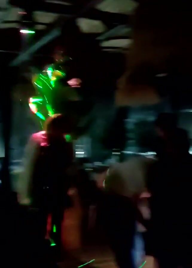 The video is taken in a dark, crowded club or bar. Several people are visible, mostly in silhouette. The room has a low ceiling with some kind of decorations or fixtures. There are moving colored lights including pink and green. It is difficult to make out details due to the darkness.