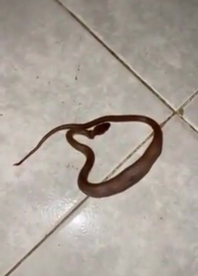 A small, reddish-brown snake is lying motionless on a light-colored, tiled floor