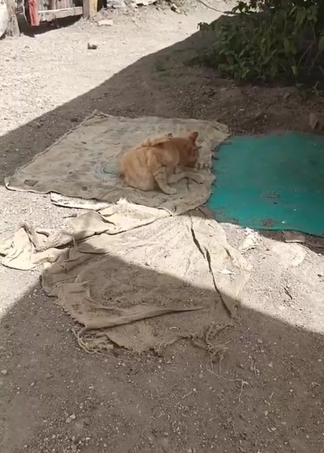 A stationary outdoor shot shows an orange cat lying on a soiled, off-white blanket in a dirt area