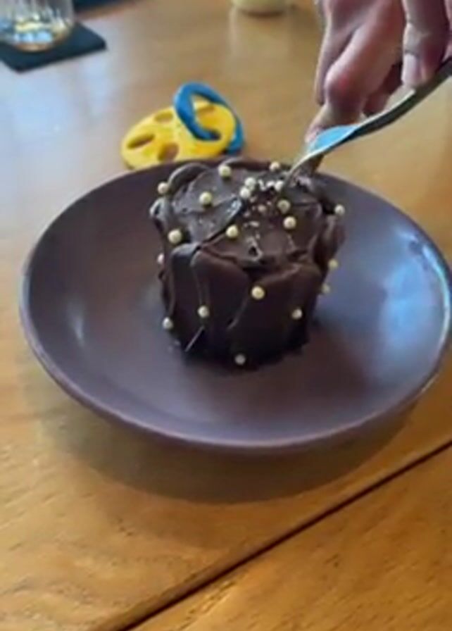 chocolate dessert being cut in half with two forks, revealing a caramel filling. The dessert, adorned with white sprinkles, sits on a brown plate on a wooden table. In the background, a glass, a baby bottle, and a baby toy are visible.