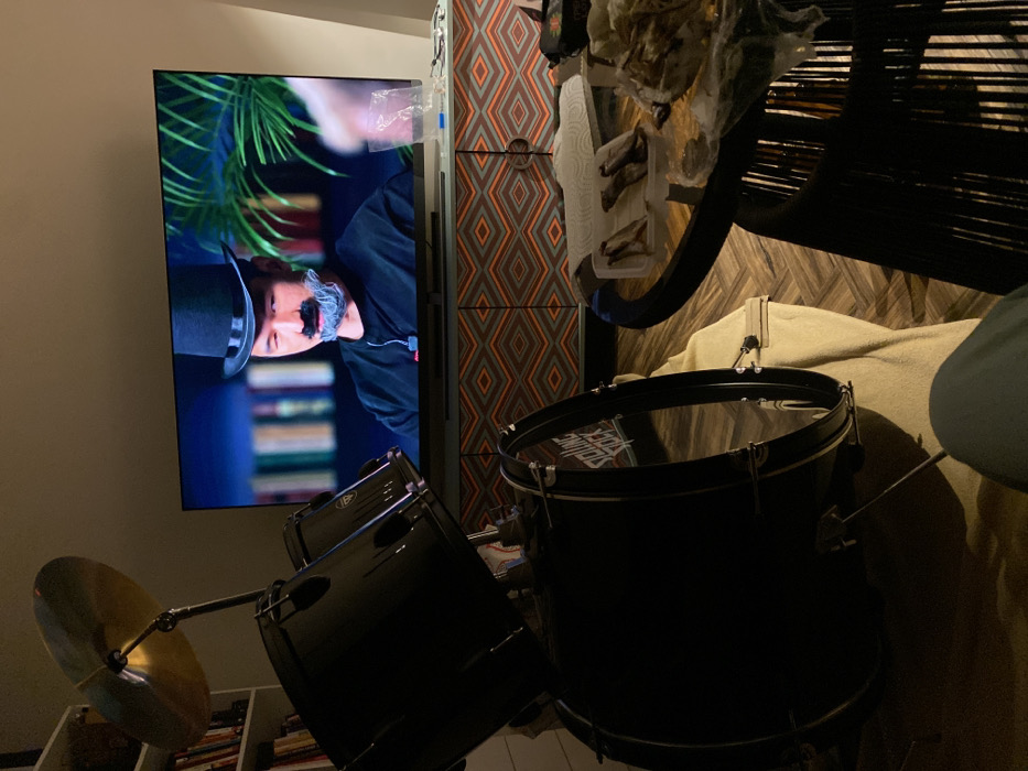 This image depicts an indoor scene within a residential setting in Ust-Ilimsk, Russia, under subdued artificial lighting. A large, flat-screen television is centered, displaying a man of East Asian descent wearing a black top hat and a prominent white, artificial-looking mustache and beard. He is dressed in a dark short-sleeved shirt. The background on the television features a bookshelf and a green potted plant. Beneath the television, a cabinet with a distinctive repeating geometric pattern in orange, grey, and teal is present. In the left foreground, a black drum kit is partially visible, consisting of a bass drum with the text "ROLLING ROCK" partially legible on its resonant head, two mounted tom-toms, and a cymbal on a stand. The drum kit is positioned on a light-colored rug or blanket. To the right foreground, a dark, circular table, possibly constructed of woven material, holds a clear plastic container containing several small, dried fish. Adjacent to this are a crumpled clear plastic bag and a translucent drinking glass. Bookshelves filled with books are visible in the far left background, behind the drum kit. The flooring appears to be dark wood planks arranged in a chevron or herringbone pattern. A person's leg, clad in green trousers, is visible in the lower foreground, suggesting a first-person perspective.