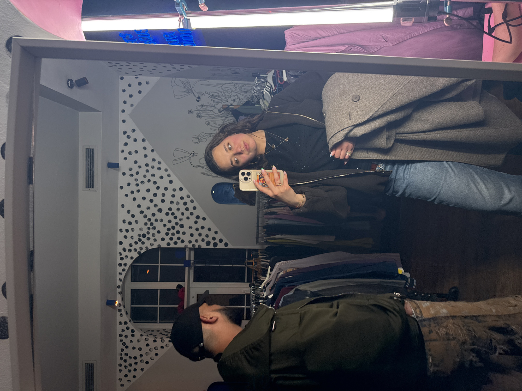 A woman is holding a smartphone, taking a mirror selfie. The reflection shows a man wearing a baseball cap in the lower part of the mirror. The woman is wearing a dark jacket over a sparkly top, jeans, and multiple rings. A grey coat is draped over her arm. Clothing racks can be seen behind her. The mirror's frame is light grey and the wall behind the mirror is white with a black polka dot design. A window is visible in the reflection behind the man. Fluorescent lights are visible at the top of the frame. There is no information to suggest the image was taken in Sofia, Bulgaria.