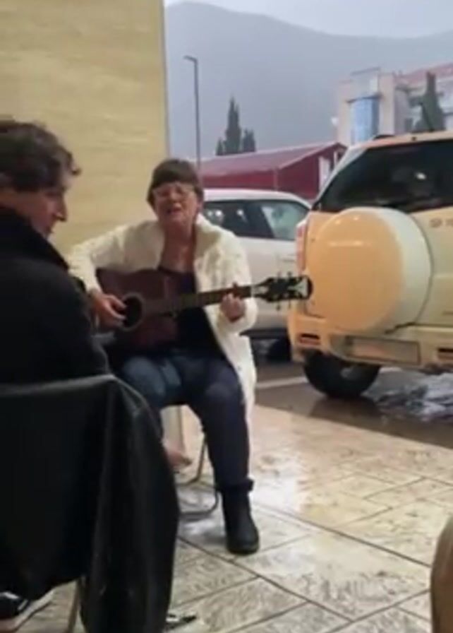 An older woman wearing glasses, a white sweater, dark pants, and black boots sits on a stool and plays a brown acoustic guitar while singing, apparently entertaining a younger man seated in a black chair to her left. The man looks at her and smiles. A third person, only partially visible, stands to the right of the frame and holds a colorful fringed scarf. The scene is outdoors on a tile patio with cars parked nearby and a mountain visible in the background. The weather appears rainy.