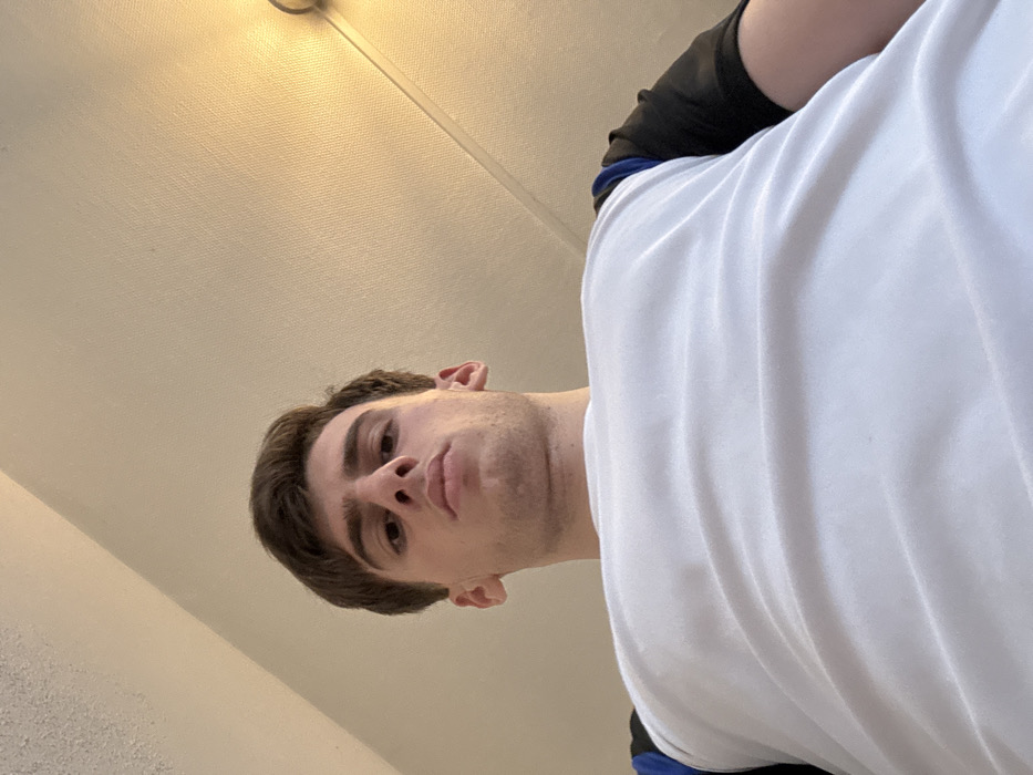 The image displays a head-and-torso shot of a male subject, positioned indoors in Strasbourg, France. The subject, a young adult with short brown hair, gazes directly at the camera with a neutral expression. He is wearing a white t-shirt featuring black short sleeves and a visible blue detail on the right shoulder. The shot is captured from a low-angle perspective, looking upwards at the subject. The background consists of a plain, light-colored, possibly textured ceiling. A light fixture, emitting a warm glow, is visible in the upper right quadrant of the frame. No other individuals or significant objects are present in the observable scene.