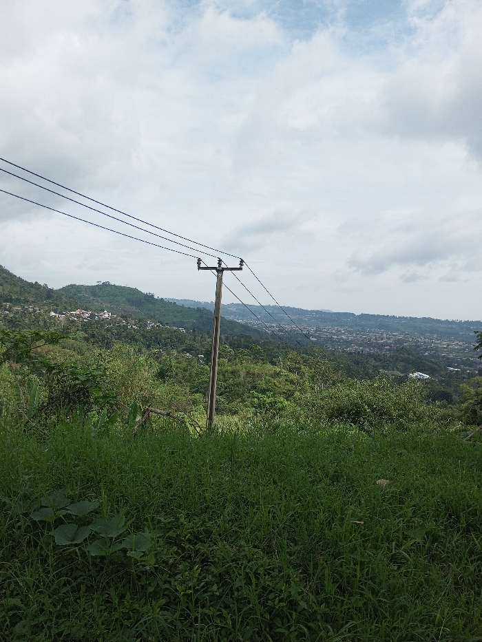 A landscape view reveals a lush, green hill with dense vegetation in the foreground. A utility pole with power lines cuts through the scene. In the distance, houses and a city are visible. The sky is filled with white and gray clouds, suggesting an overcast day. The focus is sharpest on the foreground foliage.