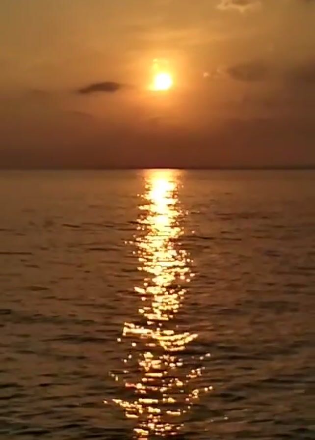 sunset over a body of water. The sun, a bright circle, is partially obscured by clouds near the horizon. A shimmering line of reflected sunlight stretches across the water towards the viewer. The water surface is rippled, causing the reflected light to sparkle. The sky has an orange hue from the setting sun.