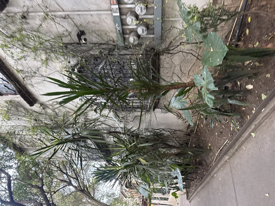 This image captures a street scene in an established urban neighborhood in Mexico City, Mexico. The foreground features a concrete sidewalk bordering a raised garden bed. The garden bed contains dark, tilled soil and a variety of dense green foliage, including several tall Yucca or Dracaena plants with spiky leaves, large-leaved plants resembling Alocasia, and upright Sansevieria plants. A low metal trim defines the edge of the garden bed against the sidewalk. Dominating the midground and background is the weathered facade of a multi-story building constructed of light grey or off-white stucco. The building exhibits signs of age, with rough texture and some surface discoloration. Several ornate, dark wrought iron grilles cover windows, one of which appears to have broken panes. Above the leftmost visible window, a partial balcony with a matching wrought iron railing is discernible. Green vines and bare woody tendrils cling to and ascend the building's facade, particularly around the windows and balcony. On the upper right portion of the building, a small, black dome-shaped security camera is mounted. Below it, a vertical panel holds a row of six round, grey utility meters, likely for electricity, with associated conduits running vertically along the wall. The upper left of the frame shows the bare, intricate branches of large deciduous trees against a bright, overcast sky. No people or active interactions are present in the scene.