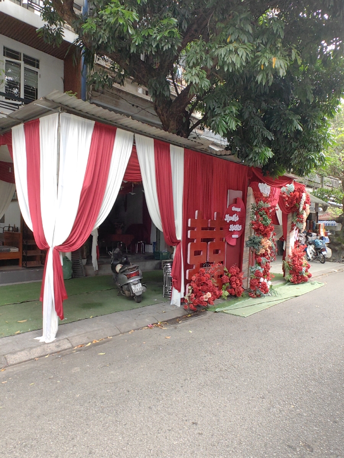 The image depicts a decorated building entrance in Phú Xuân Ward, Vietnam, viewed from the street level. A corrugated metal awning extends from a white multi-story building, beneath which elaborate red and white fabric drapes create a festive enclosure over the sidewalk. The drapes are tied back to form an arched entrance on the left, revealing interior seating. The sidewalk area directly beneath the awning is covered with green artificial turf. To the right of the fabric entrance, a large red "Double Happiness" (囍) symbol stands prominently, surrounded at its base by clusters of red artificial flowers. Adjacent to this, a small pink oval sign with Vietnamese text is affixed. Further to the right, two decorated vertical pillars, adorned with red, orange, and green artificial flowers and foliage, frame another entrance or display area. A grey scooter with a visible license plate ("75-F1 376.26") is parked on the green turf, facing slightly left. A large tree with dense green foliage grows immediately above the awning, its trunk partially visible. The foreground consists of a grey asphalt road with a concrete curb, on which scattered leaves and debris are visible. In the distance on the right, another scooter is partially visible on the street. No individuals are present in the immediate scene. The lighting suggests daytime conditions.