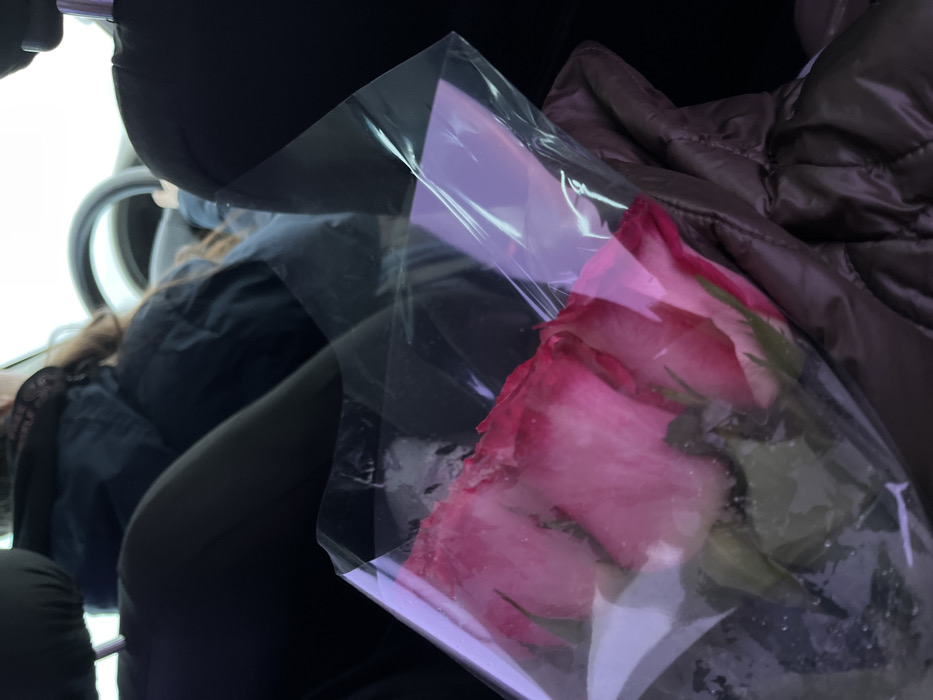 The scene is set inside a vehicle in Varenikovskaya, Russia, viewed from a rear passenger seat looking forward. In the immediate foreground, a bouquet of three pink roses, partially encased in clear plastic wrapping, rests on a dark brown or black quilted jacket. The roses show minor white discoloration on their petals, and the plastic wrap exhibits visible condensation droplets. Beyond the roses, the back of a dark-upholstered front seat is visible. Further forward, the upper torso and head of an individual, identified as the driver, are seen from behind. The driver has long, brown hair and wears a dark blue jacket, with their hands positioned on a light-colored steering wheel, indicating the vehicle is being operated or is prepared for operation.