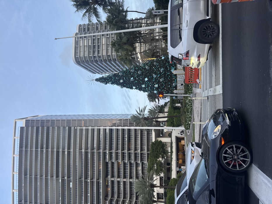 A vertical shot captures a city scene with modern architecture. A Christmas tree decorated with ornaments stands prominently, situated between two tall buildings. Palm trees are visible, adding to the tropical urban setting. Cars are parked on the street, including a black sports car in the foreground. The sky is overcast, contributing to the overall muted color palette of the photograph.