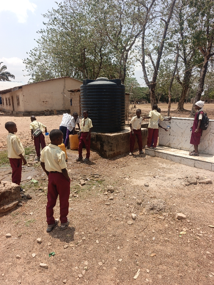An outdoor scene, likely a school compound in Unknown, Nigeria, is depicted under bright daylight