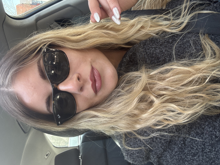 The image captures an adult female subject seated within the interior of a private passenger vehicle, located in the city of Roubaix, France. The subject, positioned centrally, is taking a selfie-style photograph. She has light-toned skin and long, wavy blonde hair with visible darker roots, parted down the center. Her eyes are obscured by dark-tinted Ray-Ban Wayfarer-style sunglasses featuring a tortoiseshell frame. Her lips are coated with a reddish-brown or plum-toned lip product. She is dressed in a dark grey textured jacket or coat. A black seatbelt strap diagonally crosses her chest on the right side of the frame. Her left hand is partially visible near her chin, displaying long, almond-shaped fingernails painted with a glossy, pearlescent white polish. The vehicle's interior features dark-colored seats and headrests in the background. Reflections within the sunglasses show elements of the car's interior and blurred outdoor surroundings.