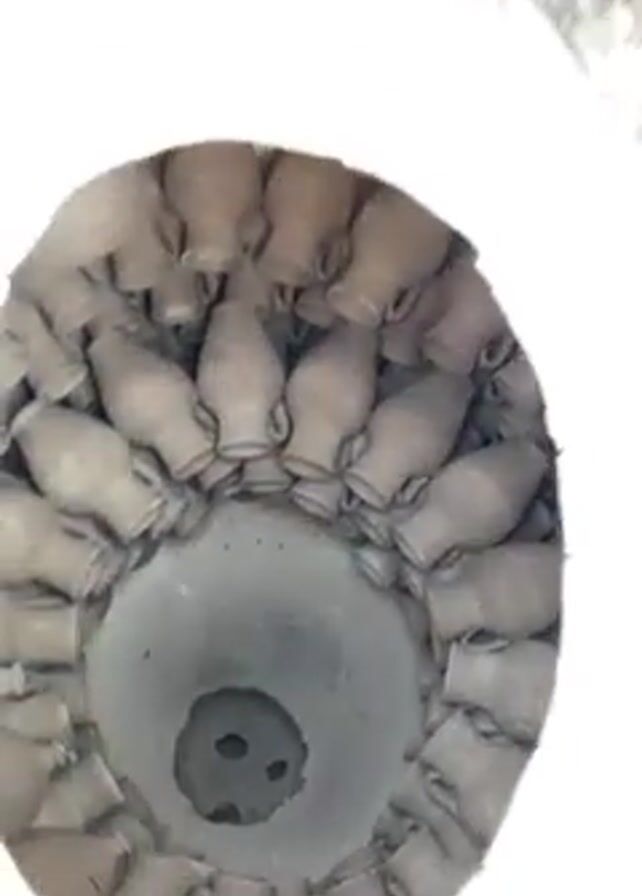A man in a turban and light green shirt holds a round, flat cover above a hole in the ground. He is preparing to cover the hole, which is surrounded by many small clay jars arranged in a circle. The hole itself appears to be part of a kiln or oven. The surrounding area is made of brick and appears to be outdoors.