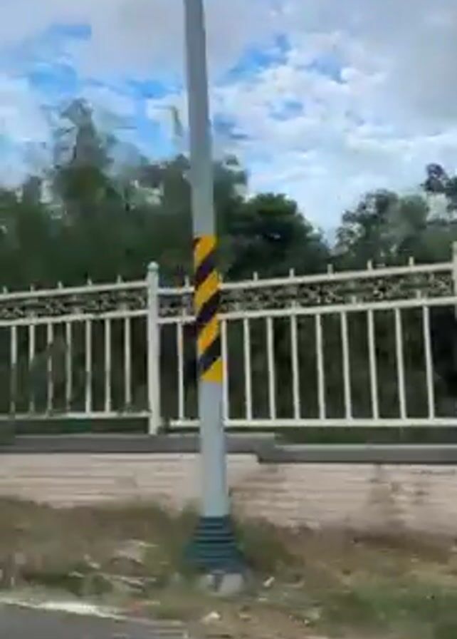 The camera films from a moving vehicle, traveling down a road beside a white metal fence
