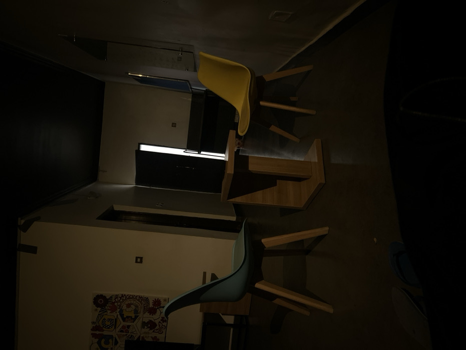 A darkly lit room features an inverted scene reflected on the floor. Two chairs, one yellow and one teal, are placed in opposite corners. An abstract art piece adorns the wall in the bottom left. A counter with a light source above is seen. The color palette is dark with low lighting.