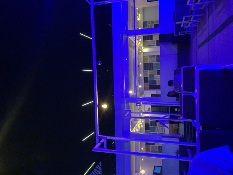 A modern, dimly lit restaurant or lounge features white metal framework with blue lighting. String lights hang between the structure. Patrons are seated in dark upholstered chairs, and a wall with multi-colored geometric tiles can be seen in the background. The outside night sky is completely dark.