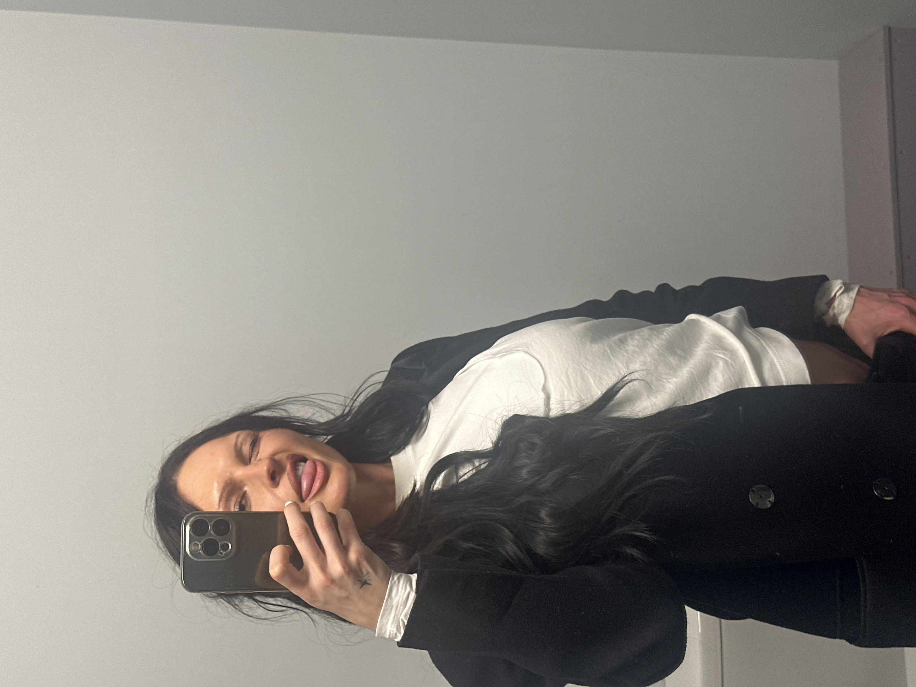 A woman takes a selfie with her phone, sticking her tongue out. She has long, dark hair and is wearing a white t-shirt with a black coat on top. The background is a plain, light gray wall. Her hand holding the phone has a small tattoo on it. The image is rotated, with the woman's head positioned towards the bottom left corner.
