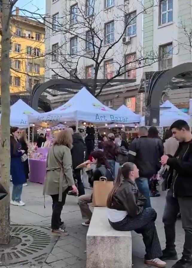 busy "Art Bazar" taking place in a city square. Several white tents are set up, with people browsing the goods on display. The square is paved with gray stone, and there are trees with bare branches scattered throughout. People of various ages and wearing different styles of clothing can be seen walking around, looking at the merchandise, and sitting on concrete benches. Buildings line the square in the background. The overall atmosphere suggests a vibrant and bustling community event.