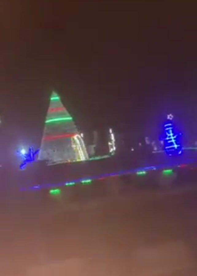 The video, shot from a moving vehicle at night, captures a street adorned with Christmas lights