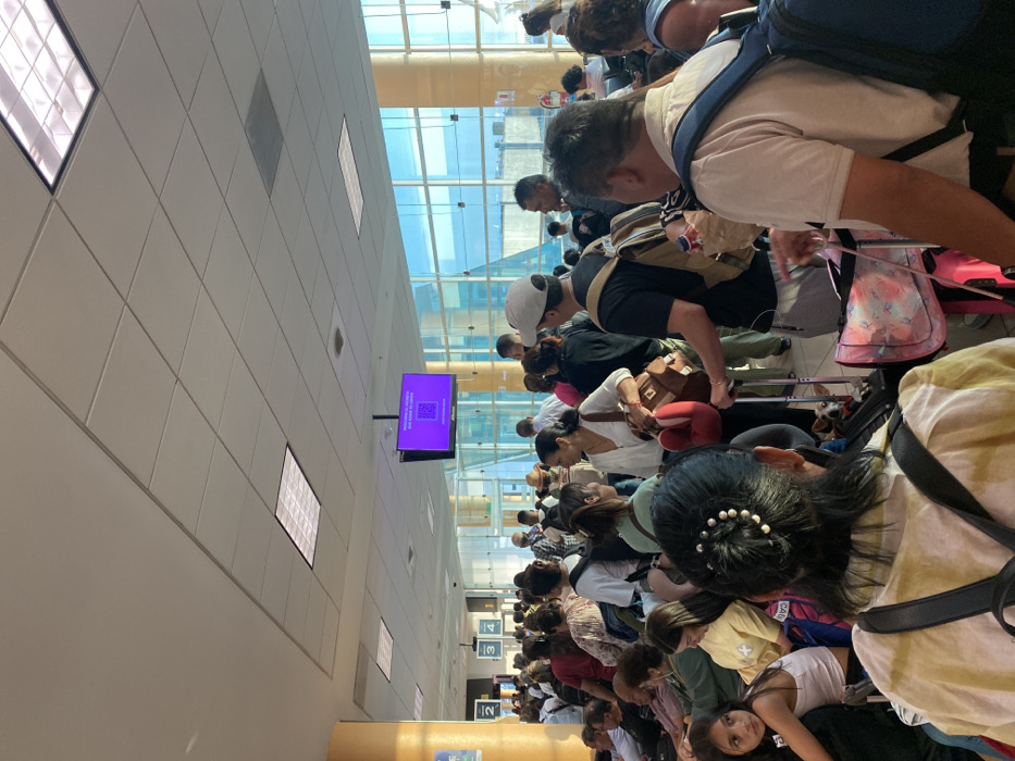 The scene takes place inside the Jorge Chávez International Airport in Callao, Peru, located at coordinates -12.026 latitude and -77.108 longitude. A large group of people are gathered in the waiting area, with the majority of them standing. Some are seated on benches and chairs, and some are walking around. There are many suitcases, backpacks, and other personal belongings scattered throughout the area. The people appear to be waiting for a flight or other transportation. The scene is brightly lit with natural light coming from large windows. An electronic sign is hanging from the ceiling with text that is too small to read.