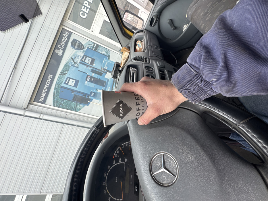 The image depicts the interior of a vehicle, specifically the driver's position in what appears to be a Mercedes-Benz Sprinter van, indicated by the steering wheel's three-pointed star logo and dashboard layout. A person's right arm, clad in a blue, long-sleeved shirt with elasticated cuffs, holds a gray paper coffee cup. The cup bears the "RIOBA" logo and the text "COFFEE ENJOY THE TASTE". The person's left hand is not visible, but a portion of blue jeans is visible on the lap. The vehicle's instrument cluster, showing a speedometer peaking at 200 km/h, is partially visible behind the steering wheel. Through the windshield, a commercial building with white corrugated metal siding is visible. A large window display on the building features "КОМПРЕСОРИ" (Compressors) in Cyrillic, along with the "CompAir" logo and "assure" branding. The display depicts several industrial air compressors. A partial view of "СЕРВ" (likely "SERVICE") is also visible on the building to the right. Based on these visible cues, the location is identified as **Ulitsa "Karabunar" 1, 5800 Pleven, Bulgaria**, the address of Air Compresori Service EOOD. On the vehicle's dashboard, a brown paper bag and a black electronic device are visible. The overall lighting suggests an overcast or interior-lit environment.