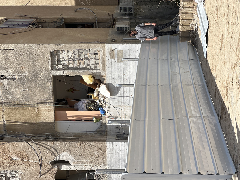 An outdoor scene in Arad, Israel, depicts a damaged multi-story building and a temporary construction fence. The building, constructed of light-colored concrete or stucco, shows extensive damage on its lower two visible levels. A large opening on the left reveals the interior of a room with a partially open wooden door, and various items, including clothing and yellow debris, are visible within and spilling outwards. To the right of this opening, a section of the wall appears demolished, exposing a grid pattern of underlying construction material. Multiple black cables are strung across the building's facade. Two white external air conditioning units are mounted on the right side of the building. In the foreground, a light grey corrugated metal fence, approximately 1.5 meters high, stretches horizontally across the image, supported by vertical metal posts. To the right of the fence, a male individual stands on a raised platform of concrete debris. He wears a grey short-sleeved collared shirt, black trousers, and a black face mask covering his mouth and nose. His right hand is in his pocket, and he is looking towards the left side of the scene. The ground in the immediate foreground is unpaved dirt or gravel, with a piece of corrugated metal debris lying on it to the right of the fence. The scene is illuminated by direct sunlight, casting distinct shadows.