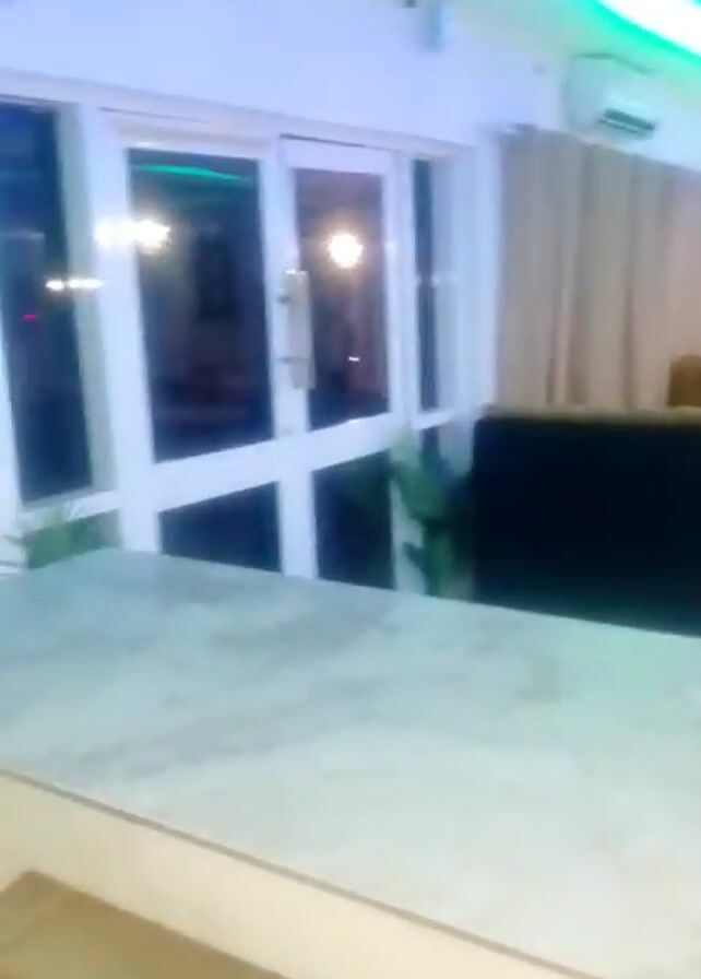 interior of a restaurant. The camera is positioned behind a counter. In the background, there's a window and seating, including booth-style seats upholstered in mustard yellow fabric and tables with chairs. The ceiling is decorated with light blue and green LED strips. There's also an air conditioning unit mounted on the wall.