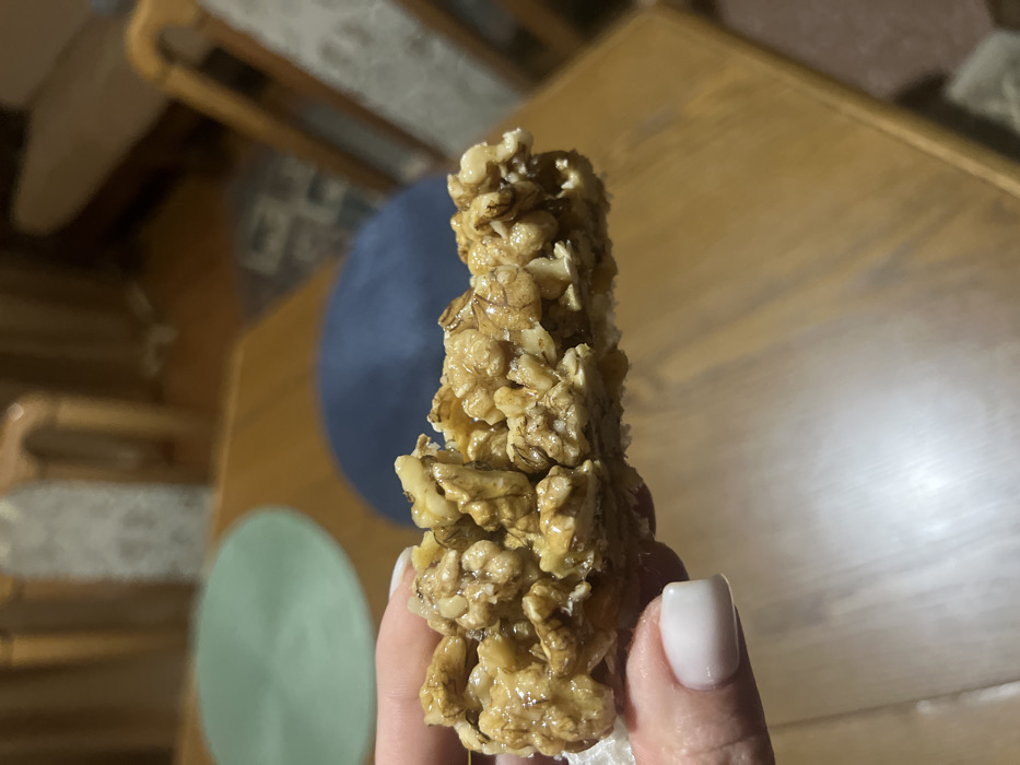 A hand holds a rectangular bar made primarily of walnuts and a sticky, translucent binder