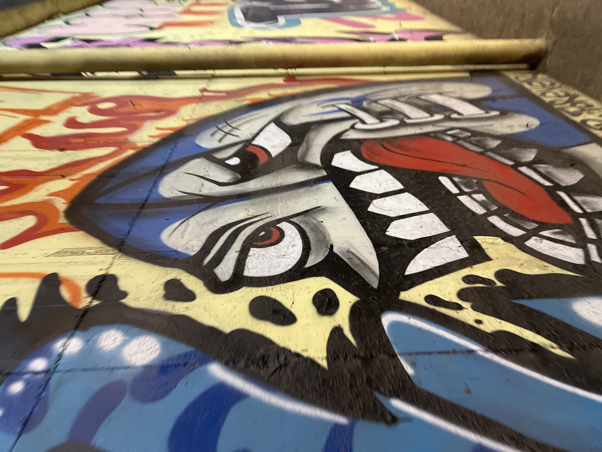 The image depicts a section of graffiti art on a ground surface