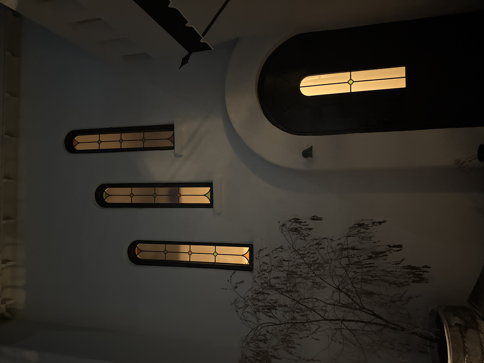 The image depicts the exterior of a building at night. Three rectangular windows are stacked vertically with lit interiors. A fourth window appears round-rectangular above the three. The building is white and the windows have dark frames. A bare tree is positioned in the lower right of the frame. The location is not identifiable by details in the image.