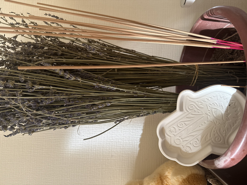 The scene, located in Tashkent, Uzbekistan, depicts an indoor arrangement of dried botanicals and ritual objects. A dark reddish-brown cylindrical planter occupies the lower-center, containing two large bundles of dried lavender stalks with faded purple florets. One lavender bundle is bound with a light brown string. Standing upright within the planter's dark substrate, to the right of the lavender, are multiple thin, light brown incense sticks; several possess bright pink tips. A light-colored, Hamsa-shaped tray with intricate embossed patterns, including an eye motif, rests on the left rim of the planter. A single, unbound incense stick stands vertically between the Hamsa tray and the lavender bundles. The background consists of an off-white, textured wall. A portion of a fluffy, light brown object and a woven basket texture are visible on the far left. No individuals are present.